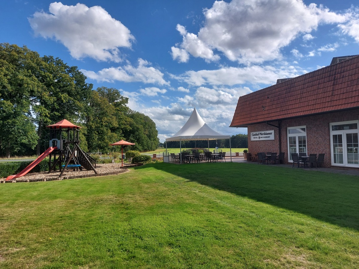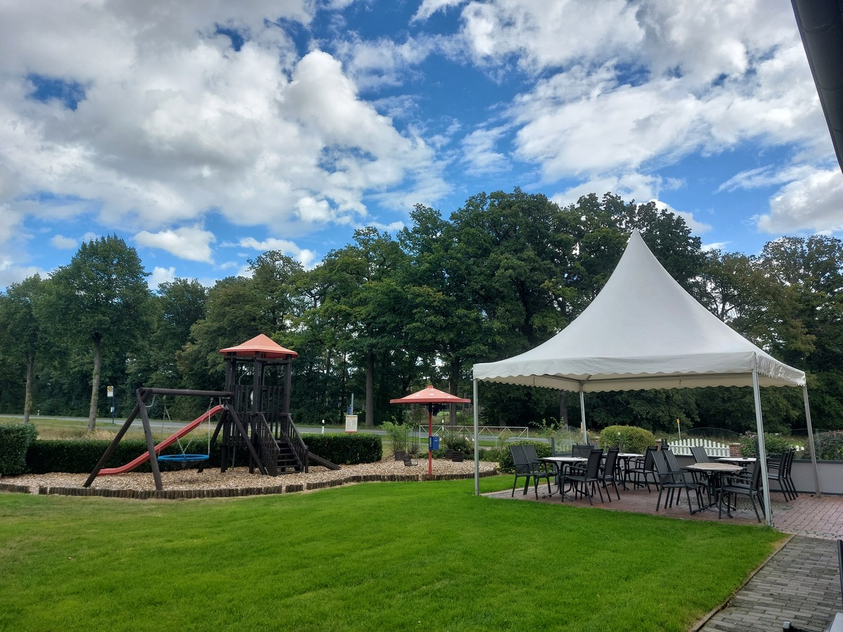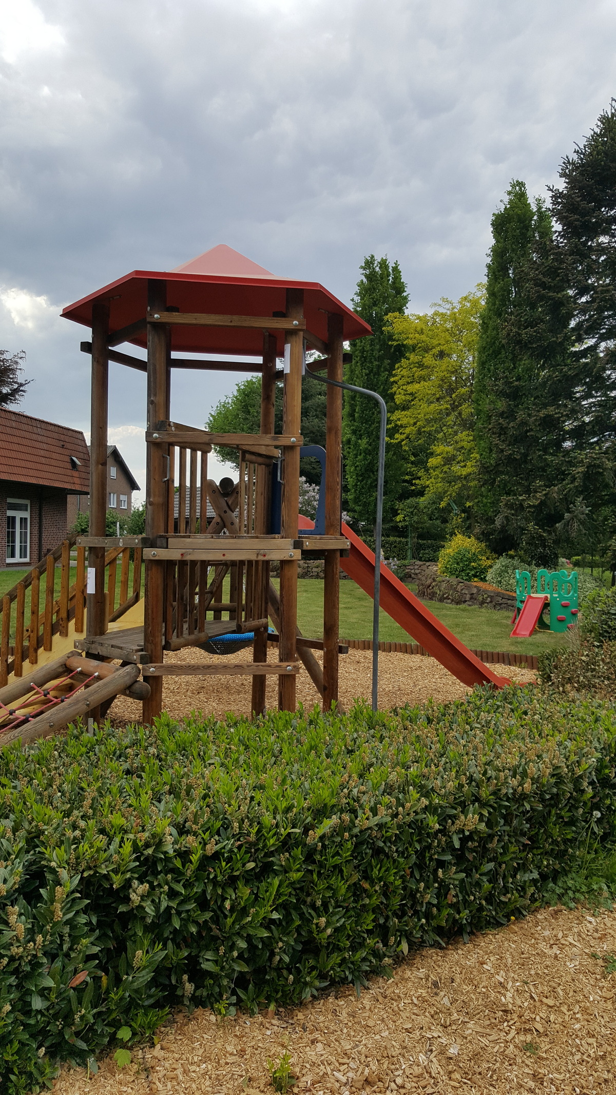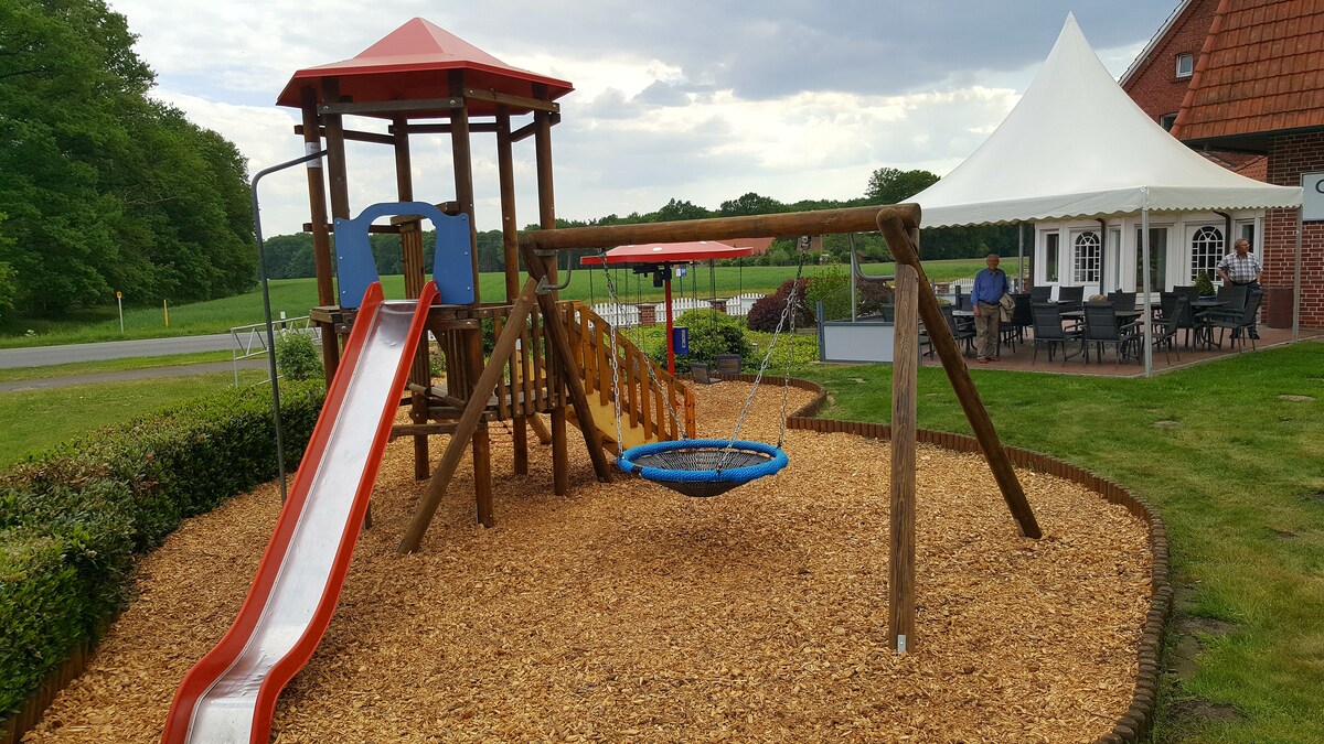Kinderspielplatz mit Karussell (kostenpflichtig), Rutsche, Kletterturm und Nestschaukel.